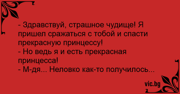 - Здравствуй, страшное чудище! Я пришел сражаться с тобой и спасти прекрасную принцессу!