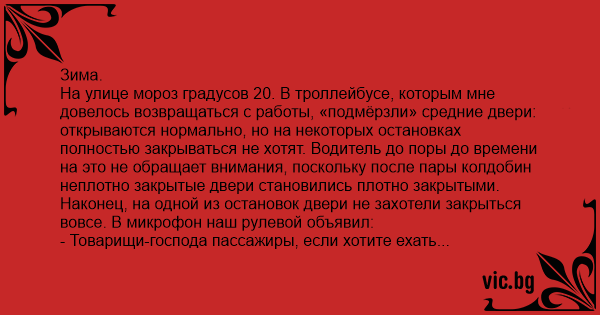 На улице мороз градусов 20. В троллейбусе, которым мне довелось возвращаться с работы, «подмёрзли» средние двери: открываются нормально, но на некоторых остановках полностью закрываться не хотят. Водитель до поры до времени на это не обращает внимания, поскольку после пары колдобин неплотно закрытые двери становились плотно закрытыми. Наконец, на одной из остановок двери не захотели закрыться вовсе. В микрофон наш рулевой объявил: