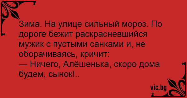 Зима. На улице сильный мороз. По дороге бежит раскрасневшийся мужик с пустыми санками и, не оборачиваясь, кричит: