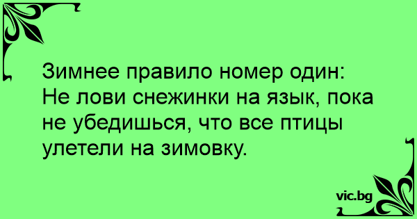 Зимнее правило номер один: Не лови снежинки на язык, пока не убедишься, что все птицы улетели на зимовку.