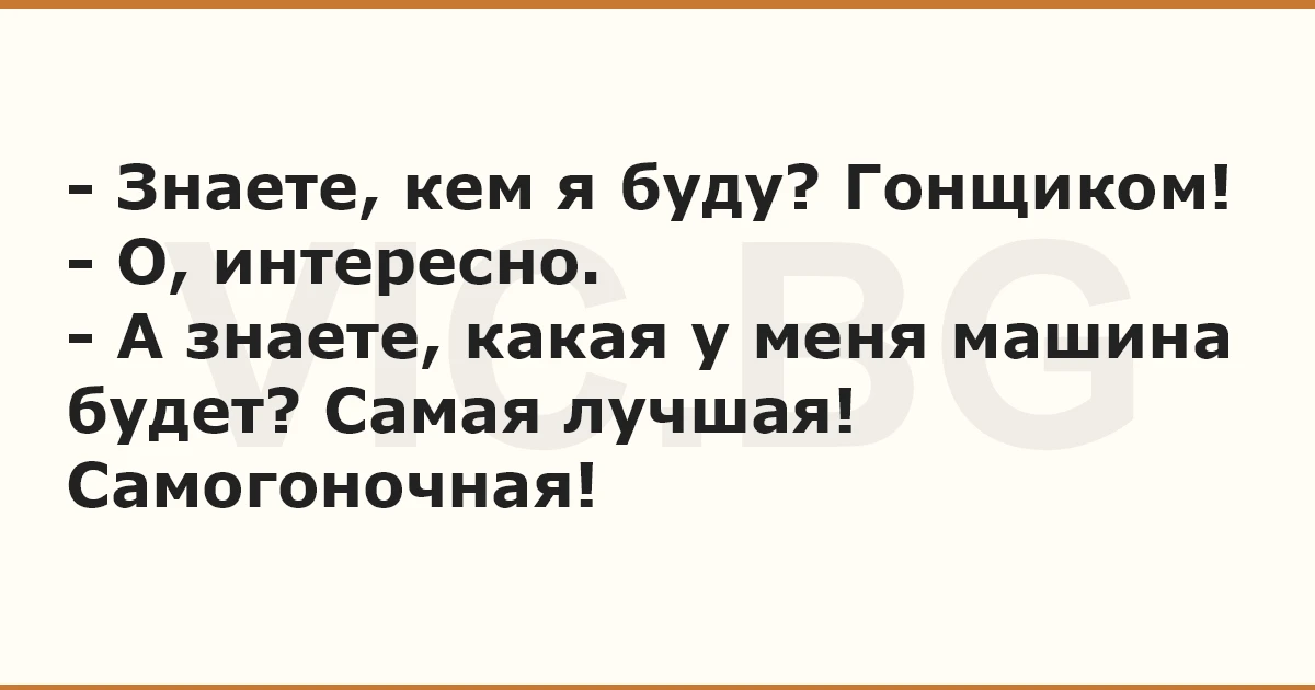 - Знаете, кем я буду? Гонщиком! - О, интересно. - А знаете, какая у меня машина будет? Самая лучшая! Самогоночная!