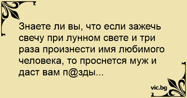Знаете ли вы, что если зажечь свечу при лунном свете и три раза произнести имя любимого человека, то проснется муж и даст вам п@зды...