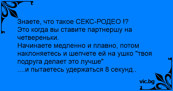 Що таке секс-родео? Трахаєте ви дівчину ззаду і в розпал цієї справи кажете їй, що її подруга робить це у 10 разів краще. А тепер утримаєте її в такому положенні 8 секунд.