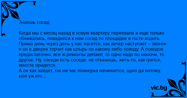 Когда мы с месяц назад в новую квартиру переехали и еще только обживались, повадился к нам сосед по площадке в гости ходить. Прямо день через день у нас пасется, как вечер наступает – звонок и он в дверях торчит как штырь по какому-либо поводу. А поводов предостаточно, все ж ремонты делают, то одно надо по мелочи, то другое. Ну, соседи есть соседи, не откажешь, жить-то, как грится, вместе придется.