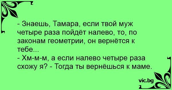 - Знаешь, Тамара, если твой муж четыре раза пойдёт налево, то, по законам геометрии, он вернётся к тебе...