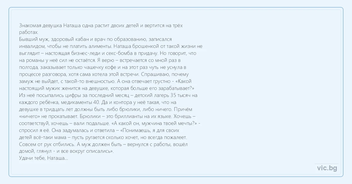 работах. Бывший муж, здоровый кабан и врач по образованию, записался инвалидом, чтобы не платить алименты. Наташа брошенкой от такой жизни не выглядит – настоящая бизнес-леди и cekc-бомба в придачу. Но говорит, что на романы у неё сил не остаётся. Я верю – встречается со мной раз в полгода, заказывает только чашечку кофе и на этот раз чуть не уснула в процессе разговора, хотя сама хотела этой встречи. Спрашиваю, почему замуж не выйдет, с такой-то внешностью. А она отвечает грустно - «Какой настоящий мужик женится на девушке, которая больше его зарабатывает?» Из неё посыпались цифры за последний месяц – детский лагерь 35 тысяч на каждого ребёнка, медикаменты 40. Да и контора у неё такая, что на девушке в тридцать лет должны быть либо брюлики, либо ничего. Причём «ничего» не прокатывает. Брюлики – это бриллианты на их языке. Хочешь – соответствуй, хочешь – вали подальше. «А какой он, мужчина твоей мечты?» - спросил я её. Она задумалась и ответила – «Понимаешь, я для своих детей всё-таки мама – пусть ругается сколько хочет, но всегда пожалеет. Совсем от рук отбились. А муж должен быть – вернулся с работы, вошёл домой, глянул - и все вокруг описались». Удачи тебе, Наташа…