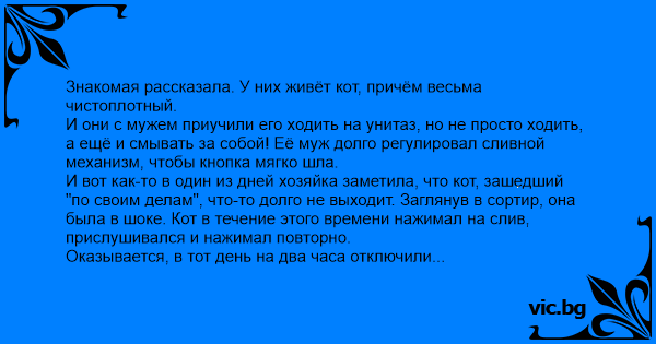 И вот как-то в один из дней хозяйка заметила, что кот, зашедший "по своим делам", что-то долго не выходит. Заглянув в сортир, она была в шоке. Кот в течение этого времени нажимал на слив, прислушивался и нажимал повторно.