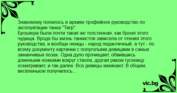 Знакомому попалось в архиве трофейное руководство по эксплуатации танка "Тигр". Брошюра была почти такая же толстенная, как броня этого чудища. Вроде бы жизнь танкистов зависела от чтения этого руководства, и вообще немцы - народ педантичный, а тут - по всему документу картинки с полуголыми девицами в самых заманчивых позах. Одна дуло прочищает, обвившись длинными ножками вокруг ствола, другая раком гусеницу осматривает, и так далее. Все девицы хихикают. В общем, весёленькое получилось руководство. Его мой знакомый использовал в качестве примера, что самый нудный текст лучше оживить, чтобы запоминался. Недавно это было научно доказано на улитках - когда им скармливали "гормон счастья", эндорфин, связи между нейронами у них формировались гораздо быстрее и прочнее. Инструкции к нашим танкам, конечно, в этом отношении уступают. Но зато я до сих пор отлично помню устный инструктаж по матчасти танка Т-80. Какие уж там полуголые девицы! То, что сержант проделывал на словах с дулом, гусеницами, нами и другими многочисленными принадлежностями танка, не пропустила бы никакая немецкая цензура...