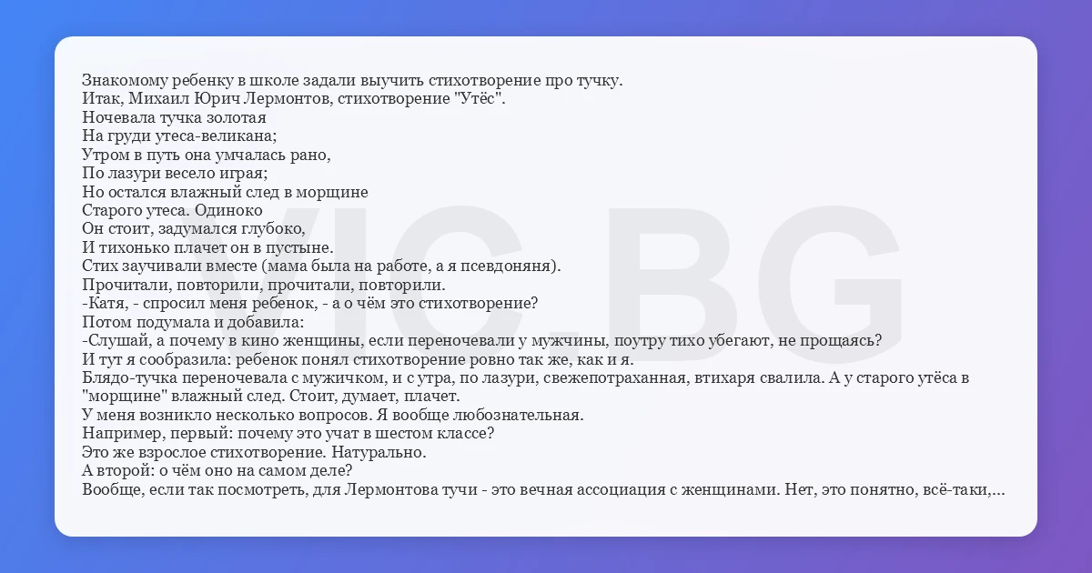 Знакомому ребенку в школе задали выучить стихотворение про тучку. Итак, Михаил Юрич Лермонтов, стихотворение "Утёс". Ночевала тучка золотая На груди утеса-великана; Утром в путь она умчалась рано, По лазури весело играя; Но остался влажный след в морщине Старого утеса. Одиноко Он стоит, задумался глубоко, И тихонько плачет он в пустыне. Стих заучивали вместе (мама была на работе, а я псевдоняня). Прочитали, повторили, прочитали, повторили. -Катя, - спросил меня ребенок, - а о чём это стихотворение? Потом подумала и добавила: -Слушай, а почему в кино женщины, если переночевали у мужчины, поутру тихо убегают, не прощаясь? И тут я сообразила: ребенок понял стихотворение ровно так же, как и я. Блядо-тучка переночевала с мужичком, и с утра, по лазури, свежепотраханная, втихаря свалила. А у старого утёса в "морщине" влажный след. Стоит, думает, плачет. У меня возникло несколько вопросов. Я вообще любознательная. Например, первый: почему это учат в шестом классе? Это же взрослое стихотворение. Натурально. А второй: о чём оно на самом деле? Вообще, если так посмотреть, для Лермонтова тучи - это вечная ассоциация с женщинами. Нет, это понятно, всё-таки, он мужик, причем, писал, будучи в самом расцвете сил. Но я вот чувствую некую обиду к тучам, вернее, к женщинам, которая вот прям сквозит. Вот, например, ещё: Тучки небесные, вечные странники! Степью лазурною, цепью жемчужною Мчитесь вы, будто как я же, изгнанники С милого севера в сторону южную. Кто же вас гонит: судьбы ли решение? Зависть ли тайная? злоба ль открытая? Или на вас тяготит преступление? Или друзей клевета ядовитая? Нет, вам наскучили нивы бесплодные... Чужды вам страсти и чужды страдания; Вечно-холодные, вечно-свободные, Нет у вас родины, нет вам изгнания. Обратите внимание на последний абзац. Ведь там же явно читается: все бабы - суки. Обидели женщины Лермонтова, ох, как обидели. А детям учи стихотворения несчастного мужичка и не понимай, откуда утёс в пустыне, чего он там плачет, и куда тучка ускакала по утру...