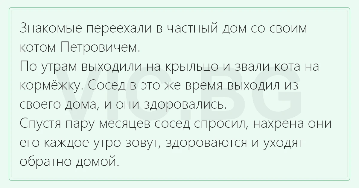 Знакомые переехали в частный дом со своим котом Петровичем. По утрам выходили на крыльцо и звали кота на кормёжку. Сосед в это же время выходил из своего дома, и они здоровались. Спустя пару месяцев сосед спросил, нахрена они его каждое утро зовут, здороваются и уходят обратно домой.