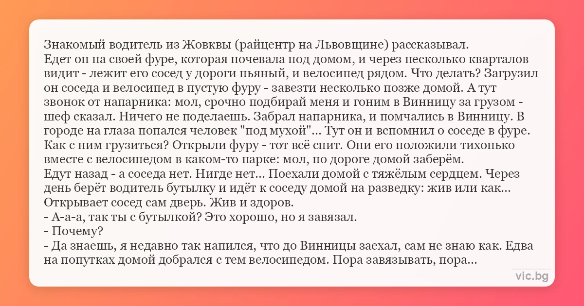 Знакомый водитель из Жовквы (райцентр на Львовщине) рассказывал. Едет он на своей фуре, которая ночевала под домом, и через несколько кварталов видит - лежит его сосед у дороги пьяный, и велосипед рядом. Что делать? Загрузил он соседа и велосипед в пустую фуру - завезти несколько позже домой. А тут звонок от напарника: мол, срочно подбирай меня и гоним в Винницу за грузом - шеф сказал. Ничего не поделаешь. Забрал напарника, и помчались в Винницу. В городе на глаза попался человек "под мухой"... Тут он и вспомнил о соседе в фуре. Как с ним грузиться? Открыли фуру - тот всё спит. Они его положили тихонько вместе с велосипедом в каком-то парке: мол, по дороге домой заберём. Едут назад - а соседа нет. Нигде нет... Поехали домой с тяжёлым сердцем. Через день берёт водитель бутылку и идёт к соседу домой на разведку: жив или как... Открывает сосед сам дверь. Жив и здоров. - А-а-а, так ты с бутылкой? Это хорошо, но я завязал. - Почему? - Да знаешь, я недавно так напился, что до Винницы заехал, сам не знаю как. Едва на попутках домой добрался с тем велосипедом. Пора завязывать, пора...