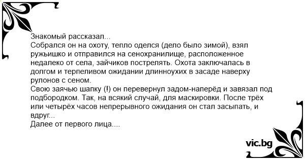 Знакомый рассказал... Собрался он на охоту, тепло оделся (дело было зимой), взял ружьишко и отправился на сенохранилище, расположенное недалеко от села, зайчиков пострелять. Охота заключалась в долгом и терпеливом ожидании длинноухих в засаде наверху рулонов с сеном. Свою заячью шапку (!) он перевернул задом-наперёд и завязал под подбородком. Так, на всякий случай, для маскировки. После трёх или четырёх часов непрерывного ожидания он стал засыпать, и вдруг... Далее от первого лица. Последовал сильный удар по черепу... Темнота - хоть глаз выколи! Сердце от страха в пятки ушло. Потом снова видимость открылась, и звук над шапкой: "Шшух-шшшух-шшух", и шапку кто-то, б***ь, изо всех сил тянет наверх! Я чуть спросонья не обосрался: как бы шапку вместе с головой не оторвали. Оказалось, это гребаный филин сверху напал на мою заячью шапку. Подумал, гад, что зайца поймал, накрыл моё лицо крыльями, а потом чуть не утащил мою башку вместе с шапкой...