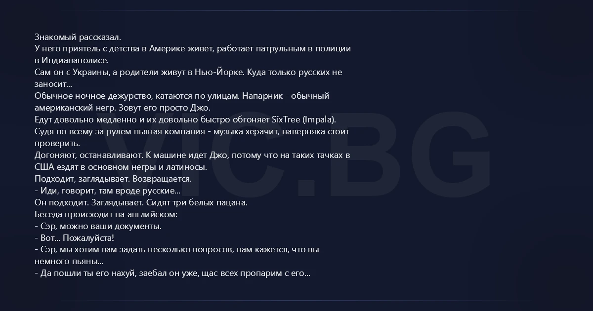 Знакомый рассказал. У него приятель с детства в Америке живет, работает патрульным в полиции в Индианаполисе. Сам он с Украины, а родители живут в Нью-Йорке. Куда только русских не заносит... Обычное ночное дежурство, катаются по улицам. Напарник - обычный американский нeгp. Зовут его просто Джо. Едут довольно медленно и их довольно быстро обгоняет SixTree (Impala). Судя по всему за рулем пьяная компания - музыка херачит, наверняка стоит проверить. Догоняют, останавливают. К машине идет Джо, потому что на таких тачках в США ездят в основном негры и латиносы. Подходит, заглядывает. Возвращается. - Иди, говорит, там вроде русские... Он подходит. Заглядывает. Сидят три белых пацана. Беседа происходит на английском: - Сэр, можно ваши документы. - Вот... Пожалуйста! - Сэр, мы хотим вам задать несколько вопросов, нам кажется, что вы немного пьяны... - Да пошли ты его нахуй, заебал он уже, щас всех пропарим с его пиздобольством! (Это была реплика с заднего сидения, на чистом русском языке) - Что он сказал? - Он... Э-эээ... А он сказал "Мы торопимся, нельзя ли побыстрей"(!) - Нет, это не займет много времени, мы только выполняем свою работу... - Да Сема, че он доебался, у нас ведь бабки есть - дать ему, пусть валит нахуй! (Опять на русском) - Что он сказал? - Он... "У нас очень ревнивые девушки, они нам не простят..." - Красиво пиздишь. (Уже на русском) - А? Ой... Блядь. Ты че, русский? Ой, извините моего брата, он не хотел, он не знал... А ВОДКИ ХОЧЕШЬ? Конфликт закончился смехом, потом он с этими пацанами познакомился, хорошие оказались ребята. Студенты, учиться приехали. Только как Джо сразу догадался, что они русские...