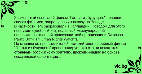 Знаменитый советский фильм "Гостья из будущего" пополнил список фильмов, запрещенных к показу на Западе. В частности, его забраковали в Голландии. Поводом для этого послужил судебный иск, поданный международной неправительственной правозащитной организацией "Хьюман Райтс Вотч" ("Human Rights Watch"). По мнению ее представителей, детский многосерийный фильм "Гостья из будущего" пропагандирует, как это ни покажется странным российскому зрителю, дискриминацию на основе сексуальной ориентации. Доказывает это, по мнению истца, заключение проведенной культурологической экспертизы. В ней указано, что в изученном экспертами аудиовизуальном произведении имеются скрытые признаки пропаганды сексуальной дискриминации. Это выражается в том, что главным отрицательным персонажам — двум лицам одного пола, принадлежащим к одной социальной группе и испытывающим "взаимную приязнь", противопоставляются положительные гетеросексуальные герои. В итоге суд удовлетворил иск и ввел запрет на трансляцию этого фильма в эфире и распространение на физических носителях на всей территории Нидерландов. (По материалам сайта uznayvse.ru)