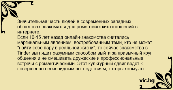 Если 10-15 лет назад онлайн-знакомства считались маргинальным явлением, востребованным теми, кто не может "найти себе пару в реальной жизни", то сейчас знакомства в Tinder выглядит разумным способом выйти за привычный круг общения и не смешивать дружеские и профессиональные встречи с романтическими. Этот культурный сдвиг ведет к совершенно неочевидным последствиям, которые кому-то могут показаться даже шокирующими.