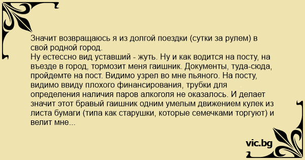 Ну естессно вид уставший - жуть. Ну и как водится на посту, на въезде в город, тормозит меня гаишник. Документы, туда-сюда, пройдемте на пост. Видимо узрел во мне пьяного. На посту, видимо ввиду плохого финансирования, трубки для определения наличия паров алкоголя не оказалось. И делает значит этот бравый гаишник одним умелым движением кулек из листа бумаги (типа как старушки, которые семечками торгуют) и велит мне сделать 3 глубоких выдоха в этот кулек. Ну надо так надо - делаю. После чего он тщательно его обнюхивает и ничего не учуяв задает мне вопрос(???): «В армии служил?».