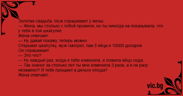 Открыват шкатулку, муж смотрит, там 3 яйца и 10000 доларов.