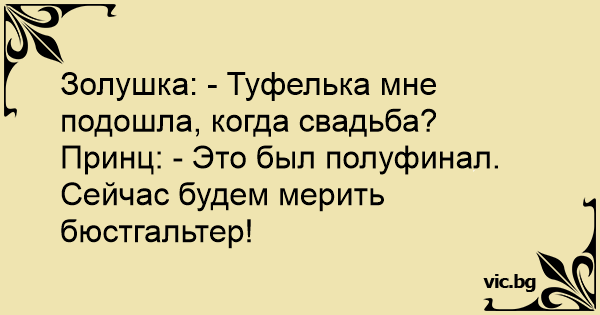 Попелюшка: - Черевичок мені підійшов, коли весілля? Принц: - Це був півфінал. Зараз будемо міряти бюстгальтер