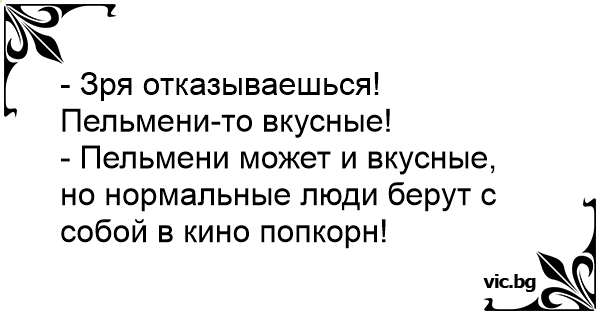 - Марче, защо не си взимаш от кюфтетата и салатата? Много са вкусни! - Оль, пельмени может и вкусные, но нормальные люди берут с собой в кино попкорн!