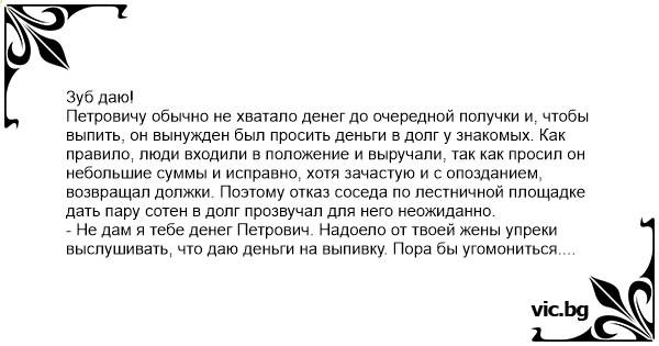- Ну, что тебе стоит пару сотен дать. – Не сдавался Петрович. – Хочешь, завтра деньги верну. Зуб даю, что верну завтра !