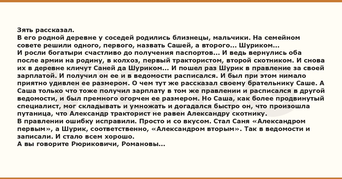 Зять рассказал. В его родной деревне у соседей родились близнецы, мальчики. На семейном совете решили одного, первого, назвать Сашей, а второго... Шуриком... И росли богатыри счастливо до получения паспортов... И ведь вернулись оба после армии на родину, в колхоз, первый трактористом, второй скотником. И снова их в деревне кличут Саней да Шуриком... И пошел раз Шурик в правление за своей зарплатой. И получил он ее и в ведомости расписался. И был при этом нимало приятно удивлен ее размером. О чем тут же рассказал своему брательнику Саше. А Саша только что тоже получил зарплату в том же правлении и расписался в другой ведомости, и был премного огорчен ее размером. Но Саша, как более продвинутый специалист, мог складывать и умножать и догадался быстро он, что произошла путаница, что Александр тракторист не равен Александру скотнику. В правлении ошибку исправили. Просто и со вкусом. Стал Саня «Александром первым», а Шурик, соответственно, «Александром вторым». Так в ведомости и записали. И стало всем хорошо. А вы говорите Рюриковичи, Романовы...