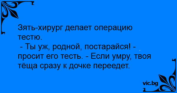 - Ты уж, родной, постарайся! - просит его тесть. - Если умру, твоя тёща сразу к дочке переедет.