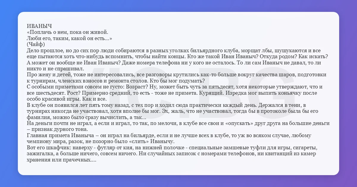 Дело прошлое, но до сих пор люди собираются в разных уголках бильярдного клуба, морщат лбы, шушукаются и все еще пытаются хоть что-нибудь вспомнить, чтобы найти концы. Кто же такой Иван Иваныч? Откуда родом? Как искать? А может он вообще не Иван Иваныч? Даже номера телефона ни у кого не осталось. То ли сам Иваныч не давал, то ли никто и не спрашивал.