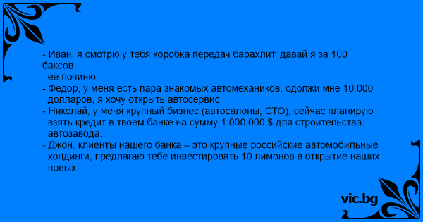 - Федор, у меня есть пара знакомых автомехаников, одолжи мне 10.000