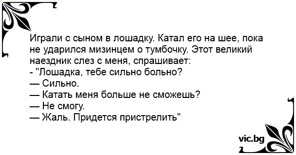 Играли с сыном в лошадку. Катал его на шее, пока не ударился мизинцем о тумбочку. Этот великий наездник слез с меня, спрашивает: