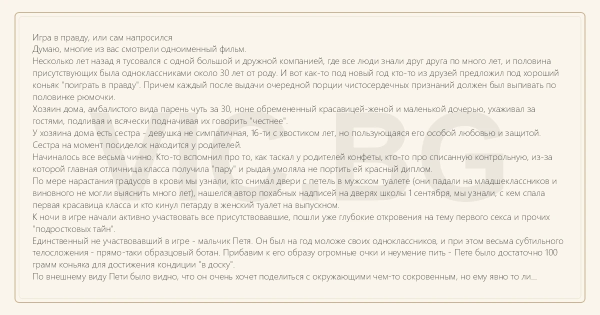 P.S. Больше игры в правду не было - все присутствовавшие пытались урезонить хозяина дома, гонявшего Петю по приусадебному участку и описывавшего близость собственных отношений со всей Петиной родней.