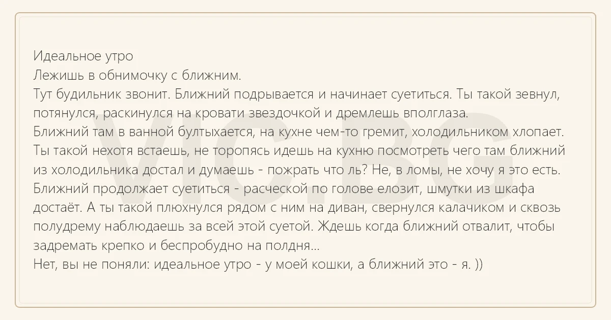 Нет, вы не поняли: идеальное утро - у моей кошки, а ближний это - я. ))