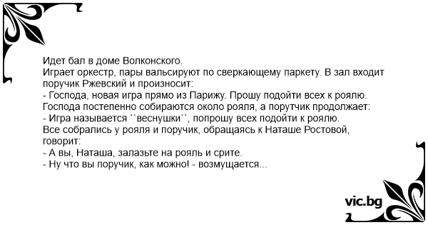 - Ну что вы поручик, как можно! - возмущается Наташа, но поручик настойчиво просит ее не выделываться, и вообще эта игра в Париже очень популярна. Делать нечего, Наташа насрала на крышку рояля.