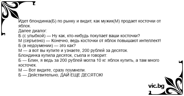 Идет блондинка(Б) по рынку и видит, как мужик(М) продает косточки от яблок.