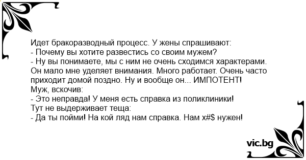 - Ну вы понимаете, мы с ним не очень сходимся характерами. Он мало мне уделяет внимания. Много работает. Очень часто приходит домой поздно. Ну и вообще он... ИМПОТЕНТ!