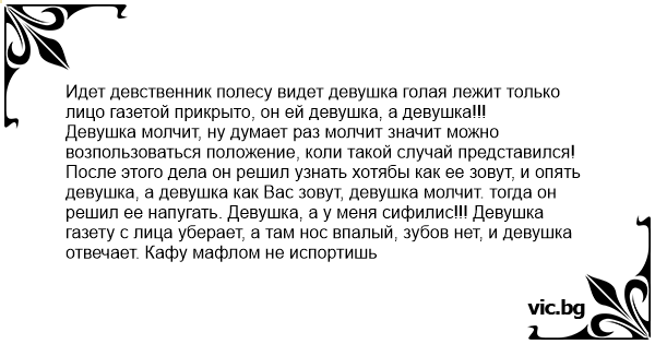 Идет девственник полесу видет девушка голая лежит только лицо газетой прикрыто, он ей девушка, а девушка!!!