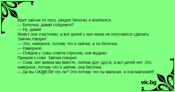 Живут они счастливо, а вот детей у них никак не получается сделать. Зайчик говорит: