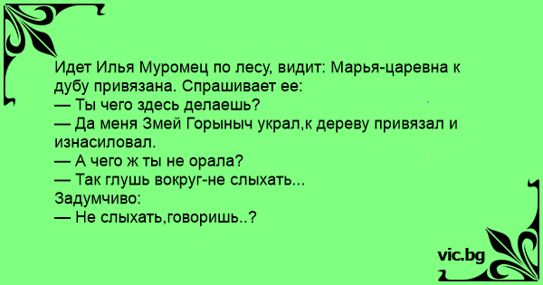 — Да меня Змей Горыныч украл,к дереву привязал и изнасиловал.