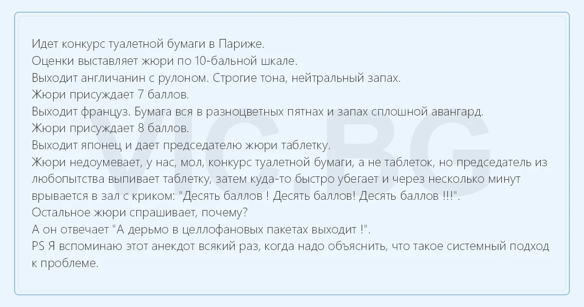 Идет конкурс туалетной бумаги в Париже. Оценки выставляет жюри по 10-бальной шкале. Выходит англичанин с рулоном. Строгие тона, нейтральный запах. Жюри присуждает 7 баллов. Выходит француз. Бумага вся в разноцветных пятнах и запах сплошной авангард. Жюри присуждает 8 баллов. Выходит японец и дает председателю жюри таблетку. Жюри недоумевает, у нас, мол, конкурс туалетной бумаги, а не таблеток, но председатель из любопытства выпивает таблетку, затем куда-то быстро убегает и через несколько минут врывается в зал с криком: "Десять баллов ! Десять баллов! Десять баллов !!!". Остальное жюри спрашивает, почему? А он отвечает "А дepьmo в целлофановых пакетах выходит !". PS Я вспоминаю этот анекдот всякий раз, когда надо объяснить, что такое системный подход к проблеме.