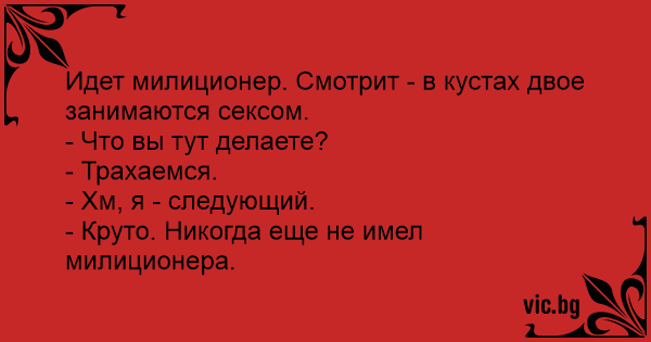 Идет милиционер. Смотрит - в кустах двое занимаются сексом.