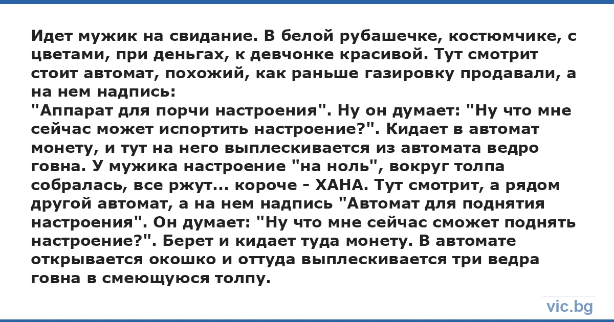 Идет мужик на свидание. В белой рубашечке, костюмчике, с цветами, при деньгах, к девчонке красивой. Тут смотрит стоит автомат, похожий, как раньше газировку продавали, а на нем надпись: "Аппарат для порчи настроения". Ну он думает: "Ну что мне сейчас может испортить настроение?". Кидает в автомат монету, и тут на него выплескивается из автомата ведро говна. У мужика настроение "на ноль", вокруг толпа собралась, все ржут... короче - ХАНА. Тут смотрит, а рядом другой автомат, а на нем надпись "Автомат для поднятия настроения". Он думает: "Ну что мне сейчас сможет поднять настроение?". Берет и кидает туда монету. В автомате открывается окошко и оттуда выплескивается три ведра говна в смеющуюся толпу.