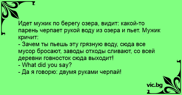 Идет мужик по берегу озера, видит: какой-то парень черпает рукой воду из озера и пьет. Мужик кричит: