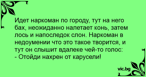 Един пияница наквасен се кандилкал в парка. Изведнъж какво да види? Срещу него отнякъде изкочил някакъв елен. Блъснал го на земята и изчезнал нататък. Пияндето втрещен тръгнал да се изправя и ... ужас! В следващия миг отнякъде изкочила мечка. Блъснала го и тя и без да му обръща внимание,...
