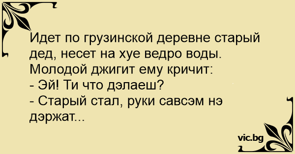 Идет по грузинской деревне старый дед, несет на хуе ведро воды. Молодой джигит ему кричит:
