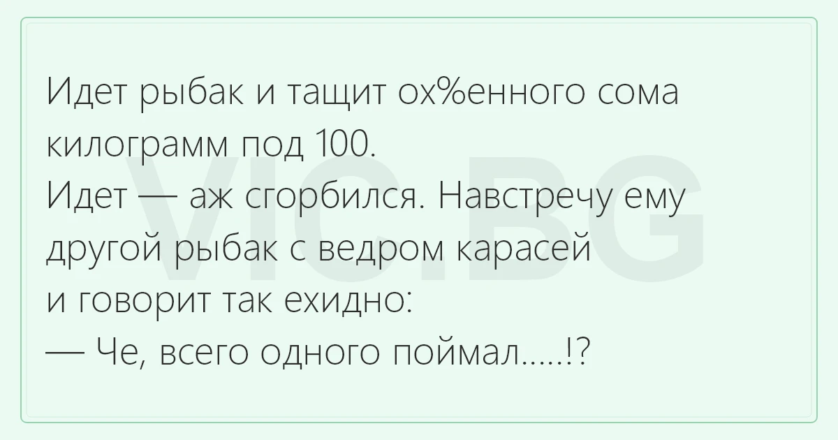 Идет — аж сгорбился. Навстречу ему другой рыбак с ведром карасей