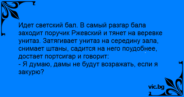 Идет светский бал. В самый разгар бала заходит поручик Ржевский и тянет на веревке унитаз. Затягивает унитаз на середину зала, снимает штаны, садится на него поудобнее, достает портсигар и говорит: