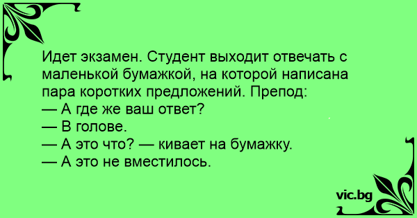 Идет экзамен. Студент выходит отвечать с маленькой бумажкой, на которой написана пара коротких предложений. Препод: