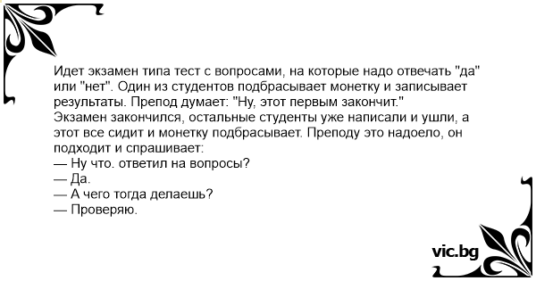 Идет экзамен типа тест с вопросами, на которые надо отвечать "да" или "нет". Один из студентов подбрасывает монетку и записывает результаты. Препод думает: "Ну, этот первым закончит."