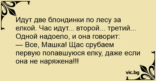 Пішли дві блондинки в ліс за ялинкою. Годину йдуть, другу, третю… Одній набридло, вона й каже: — Усе, Юлю! Рубаймо першу ліпшу ялинку, навіть якщо вона не прикрашена!