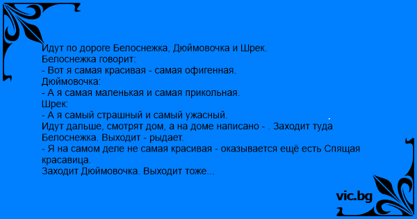 Вървят си през гората Пепеляшка, Палечка и Шрек и си говорят.