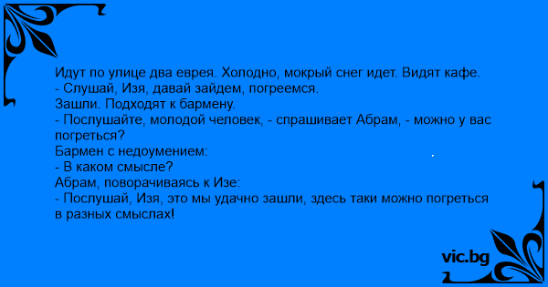 Идут по улице два еврея. Холодно, мокрый снег идет. Видят кафе.